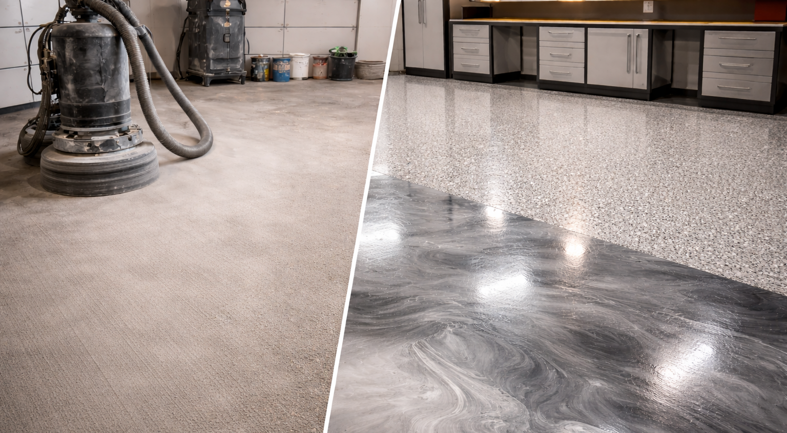 A true professional epoxy installation includes mechanical surface grinding, crack and surface repair, moisture testing, base coat application, decorative layer if selected, and a protective topcoat.